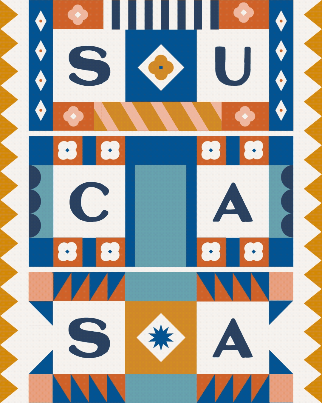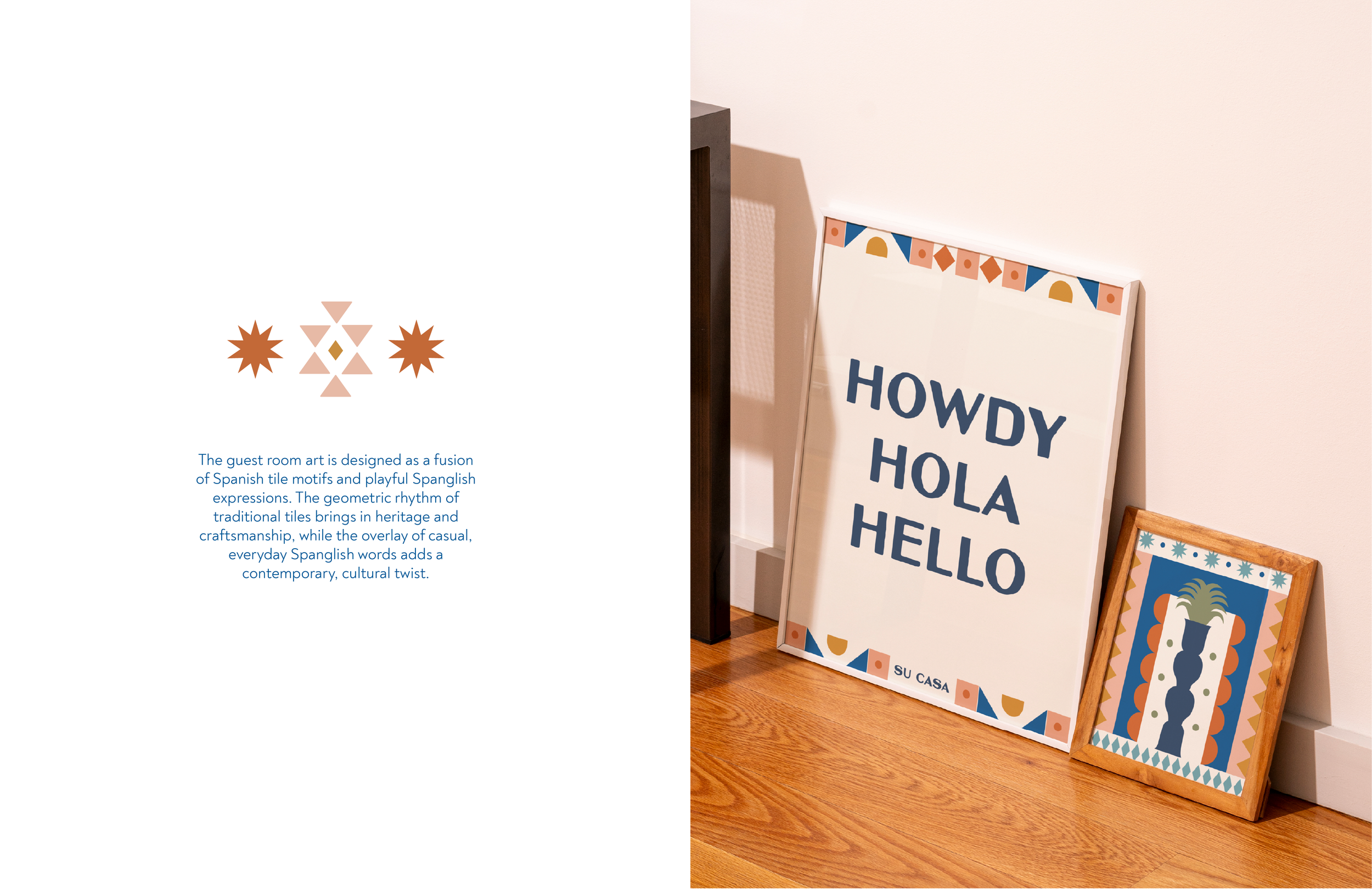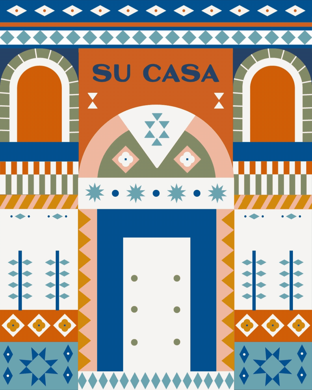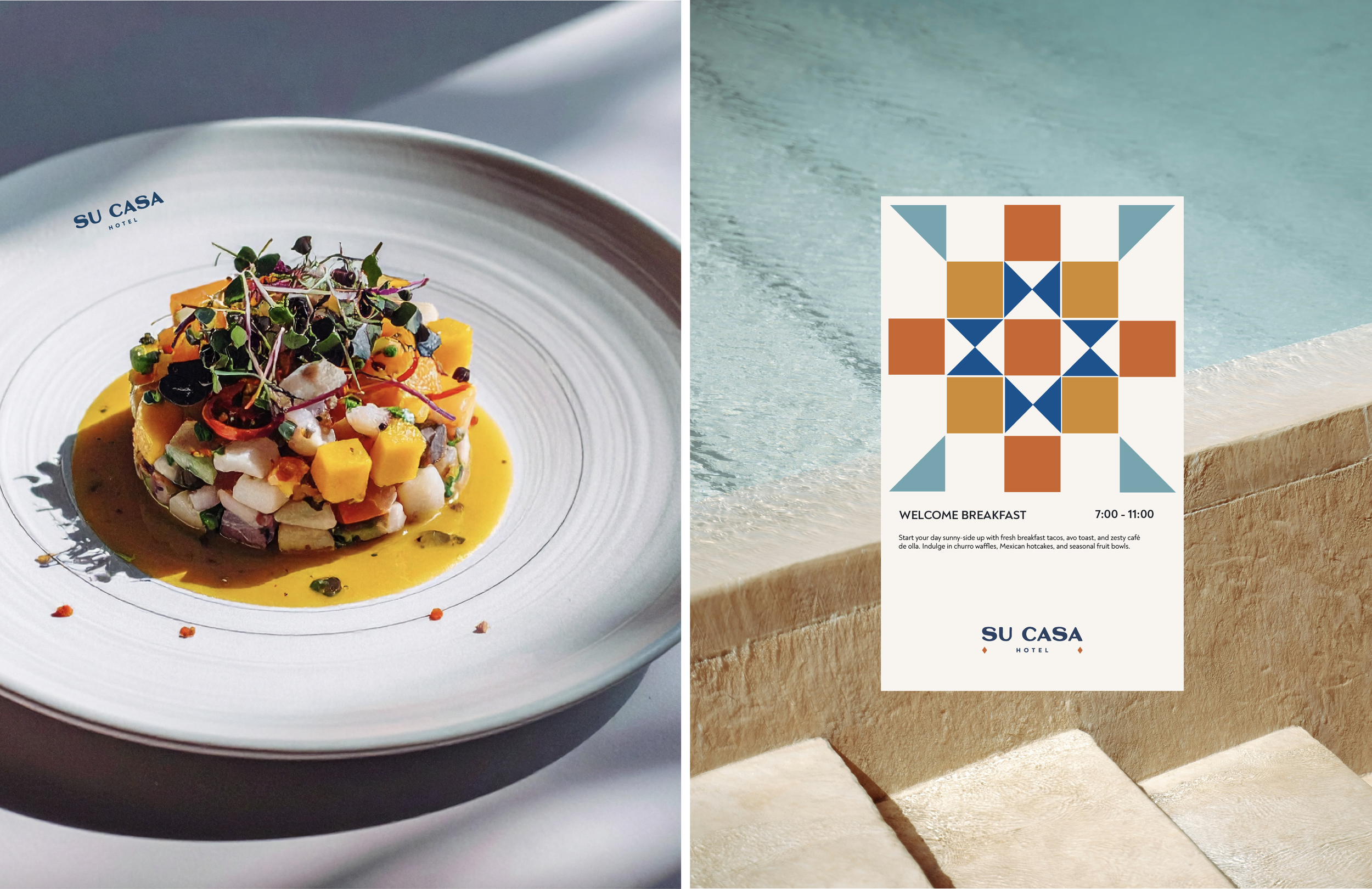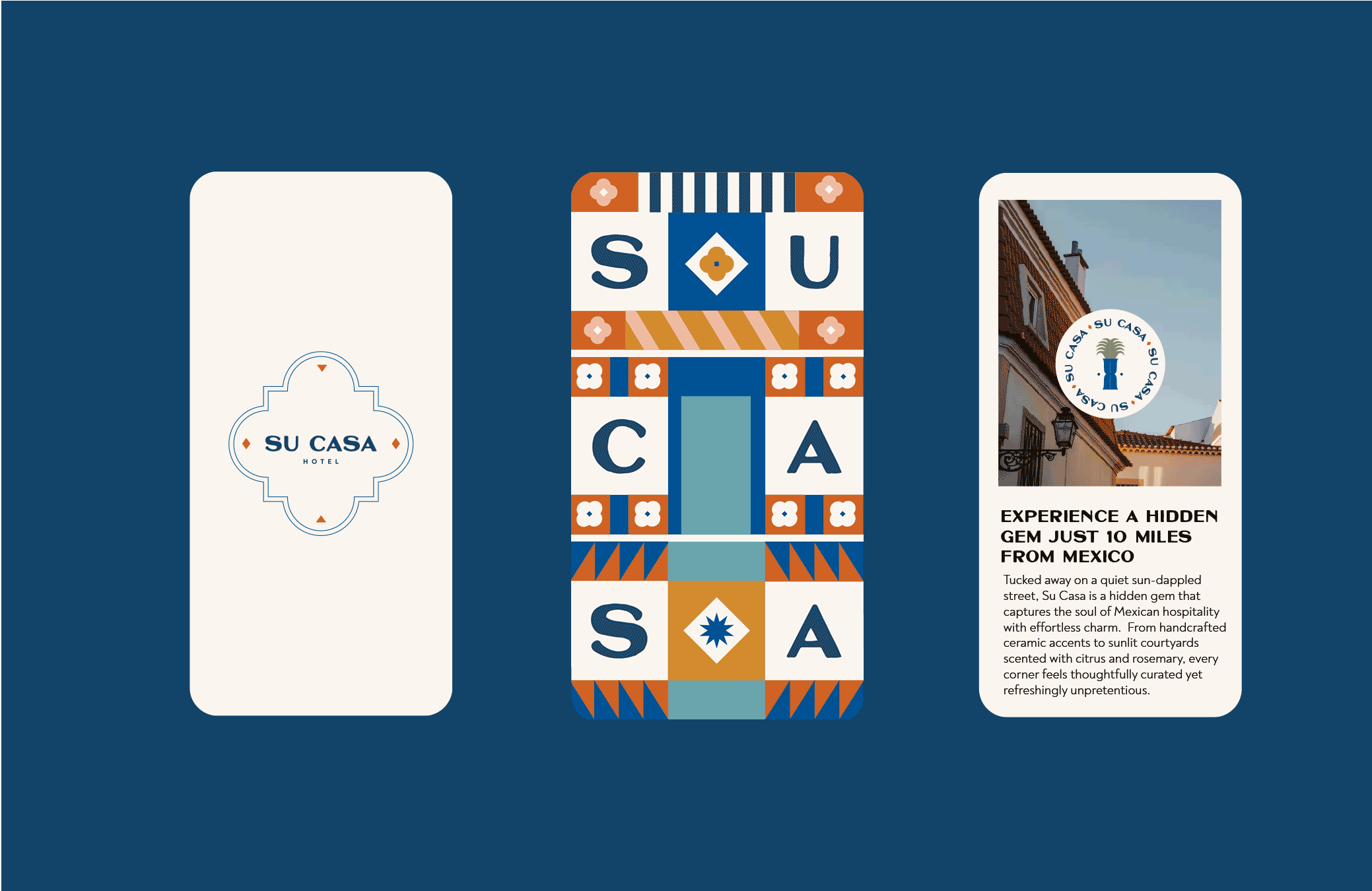 Branding for the Su Casa Hotel identity in collaboration with HAHA TITI Hospitality Creative Studio based in California. We did the branding inspired by the idea of two cultures converging at the border. Su Casa personifies the fusion of California and Baja California, offering a unique blend of Spanish and American cultures. Our branding concept draws inspiration from the vibrant, modern Spanish bohemian vibe, blending it seamlessly with clean, contemporary lines. We have crafted a unique set of motifs and patterns, reimagining the traditional allure of Spanish and Mexican tiles and art with a fresh twist.We structured the mural inspired by Spanish Mexican tiles and created a graphic set for the brand. All illustrations were developed by the studio. We designed several secondary logos so that they can be used differently for different collaterals.